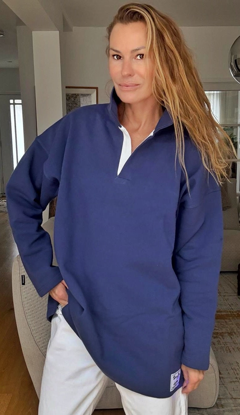 This deep Navy Sloppy Joe colour is dyed using 'Reactive Dye'. This makes it a solid colour and the fabric soft and floppy.