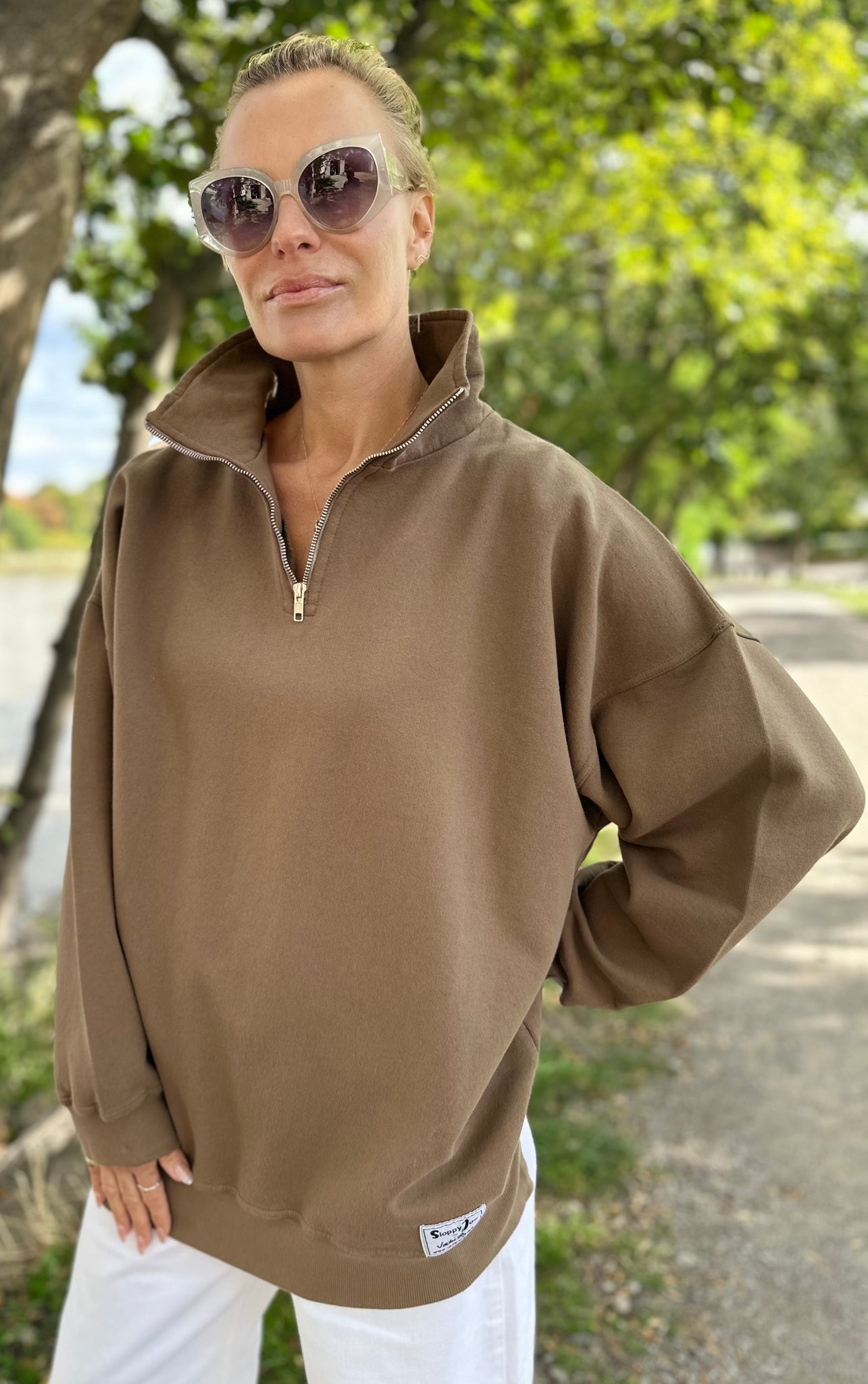 The Diana Zip Neck has an open neck with zip, and a distinctive oversized quality sweatshirt appeal. The style features ribbed cuffs and hem, with flattering side splits and a hem tag detail.