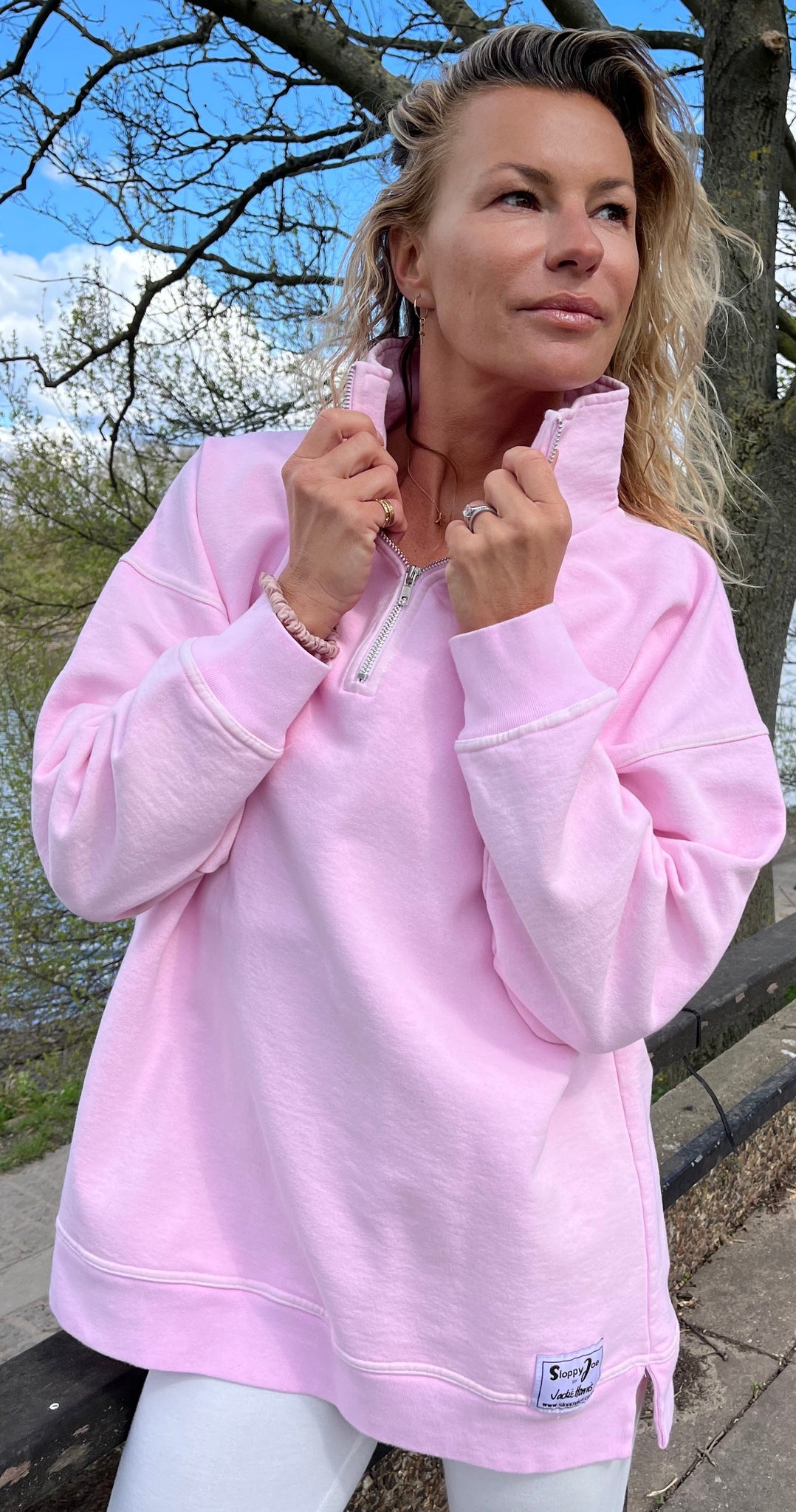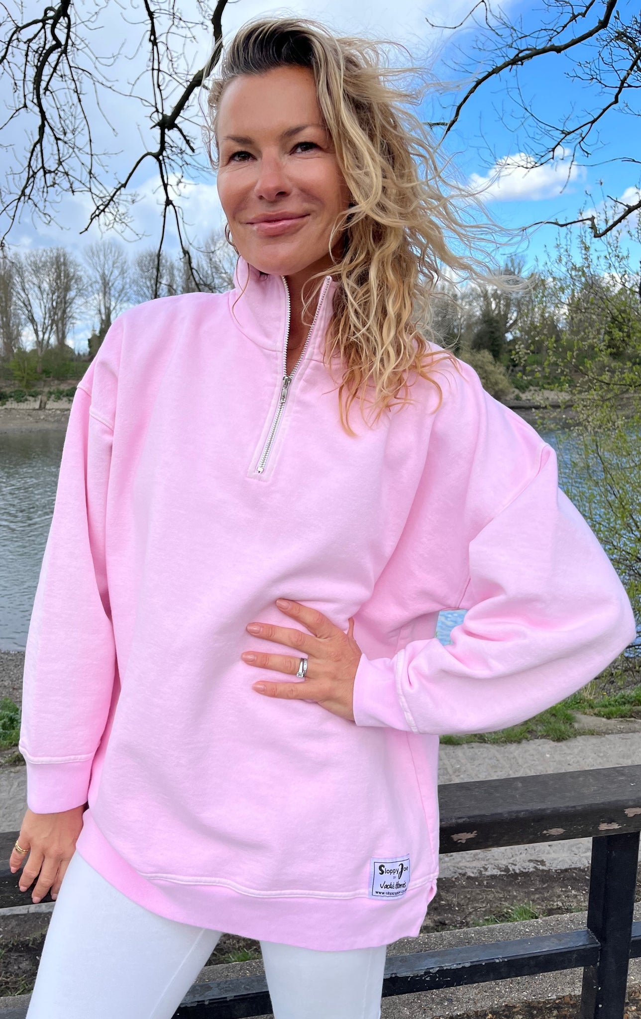 The Diana Zip Neck has an open neck with zip, and a distinctive oversized quality sweatshirt appeal. The style features ribbed cuffs and hem, with flattering side splits and a hem tag detail.
