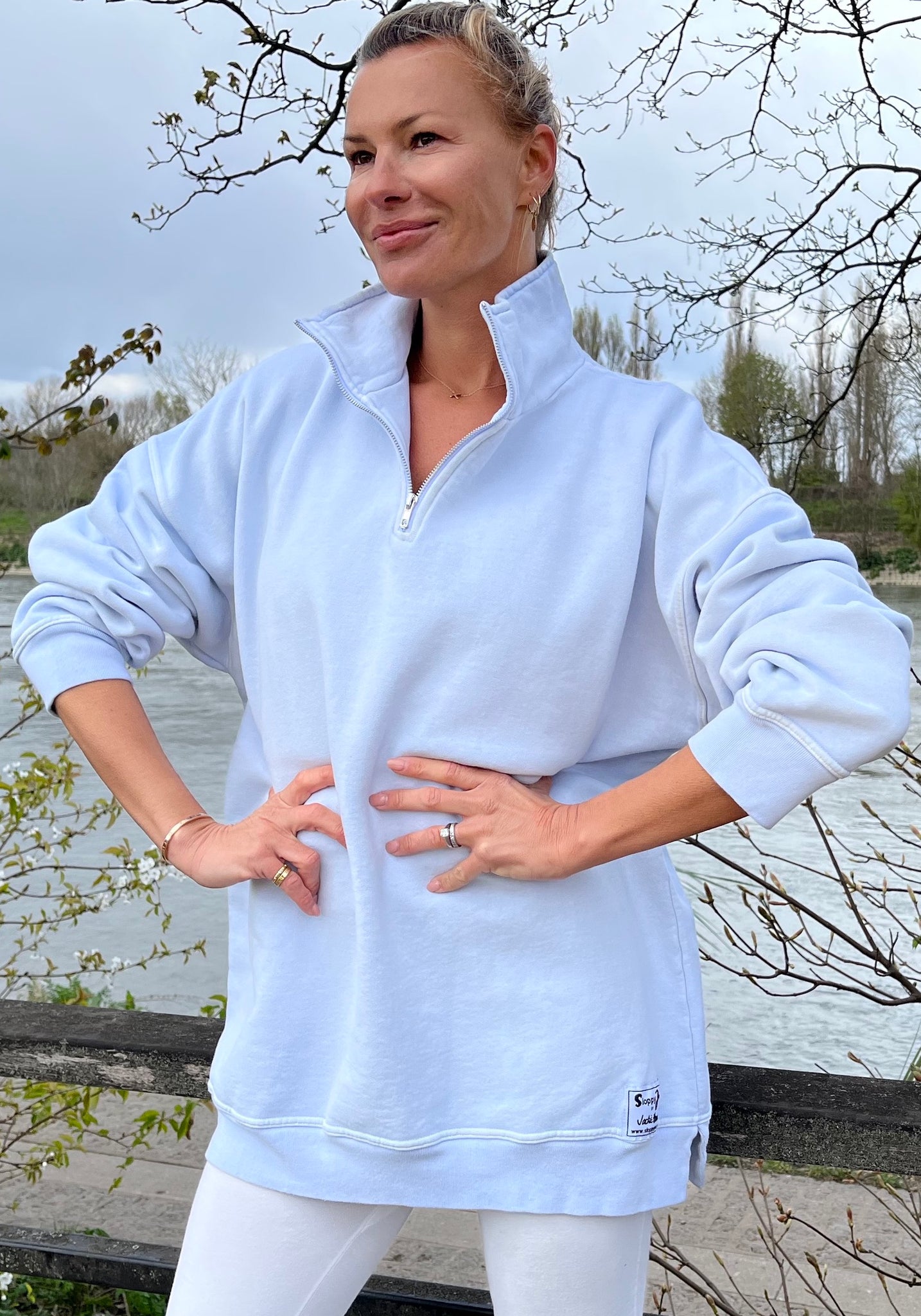 The Diana Zip Neck has an open neck with zip, and a distinctive oversized quality sweatshirt appeal. The style features ribbed cuffs and hem, with flattering side splits and a hem tag detail.